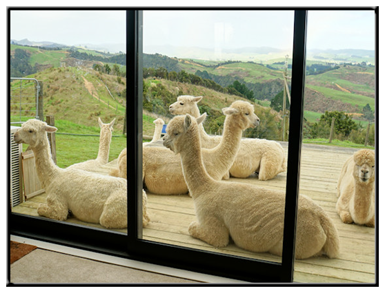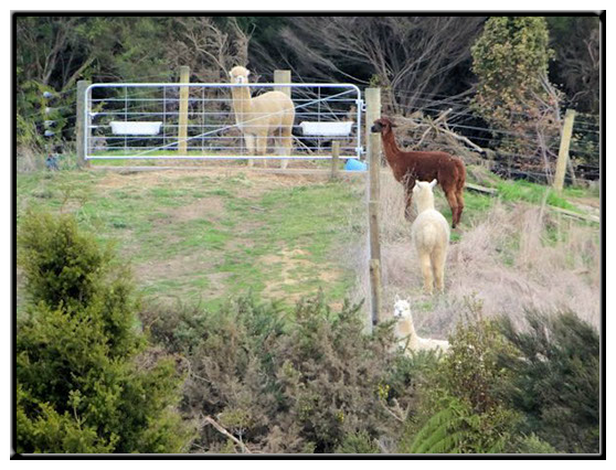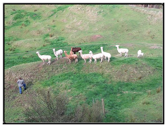Our alpacas have access to about 12 acres of pasture, the majority quite steep with interwoven flats. We allocate the various mobs at least 2 paddocks, so they can move around and collect at the various meeting points for coffee!